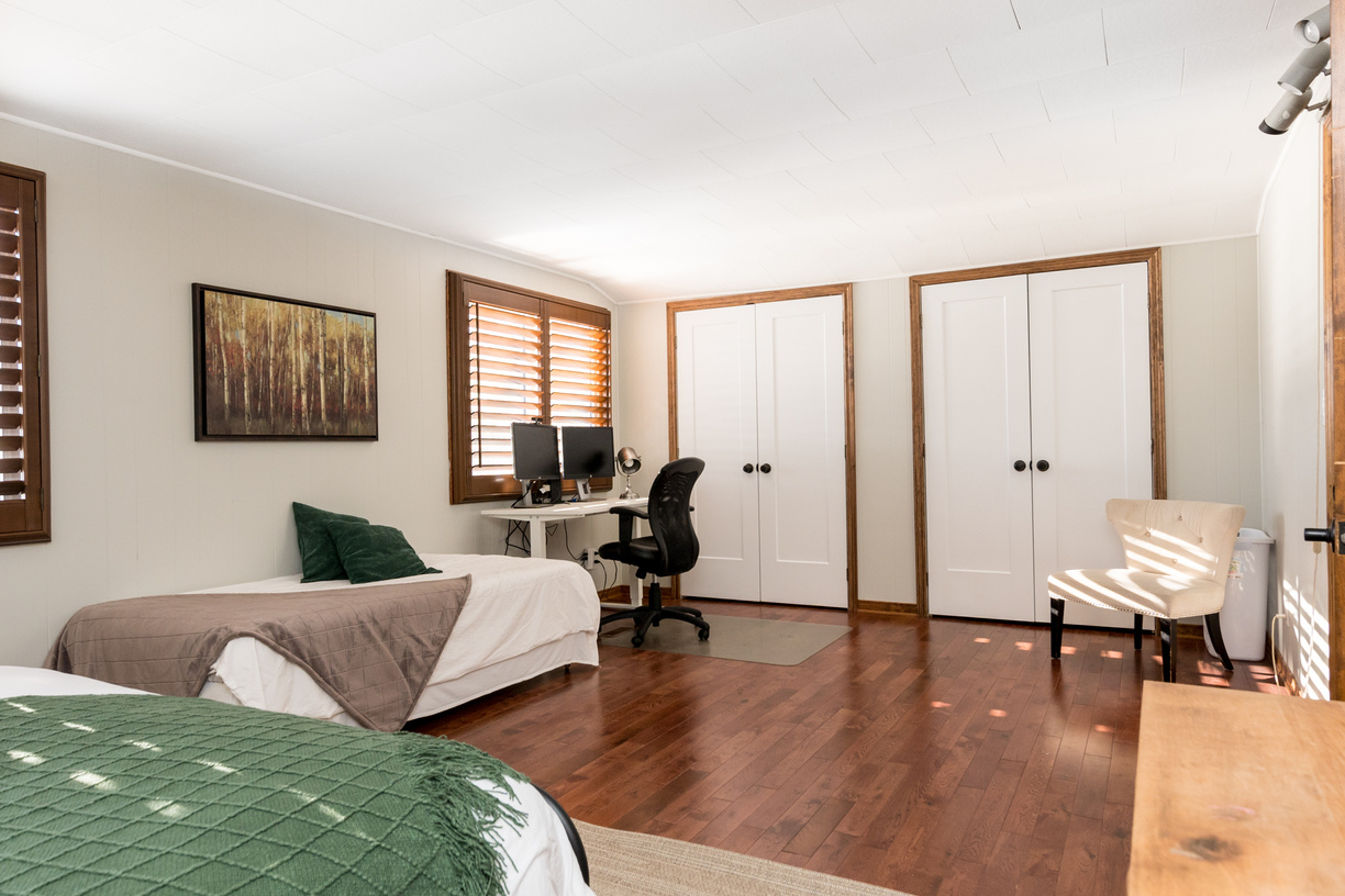 The workspace in the master "Lakeview" bedroom is a perfect spot for those who need to work while away on vacation. The two large computer screens on a desk with a cushiony chair provide ample space and comfort for a productive work environment.